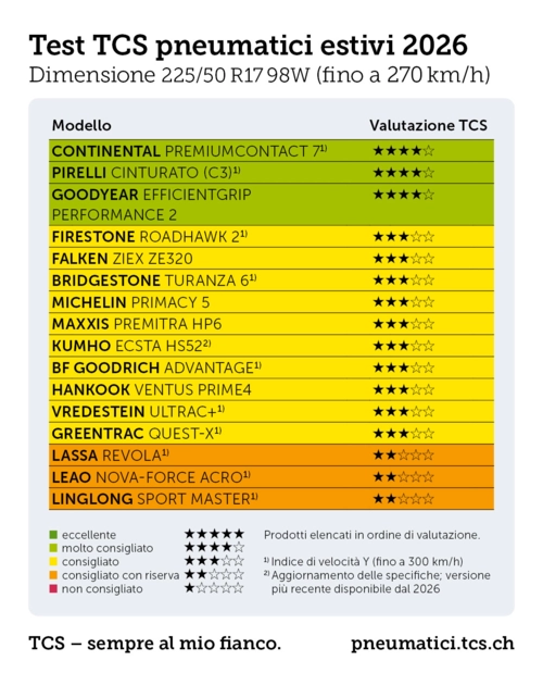 Nel test attuale del reparto Test & Tecnica del Touring Club Svizzero sono stati testati 16 pneumatici estivi nella misura 225/50 R17 98W/Y. Questa misura è adatta a veicoli di classe media come VW Sharan, Audi A4, A5 o TT, BMW serie 2, 3 e 4, Skoda Octavia Scout e Yeti, Alfa Romeo Giulia, Peugeot 3008 e 5008 e Volvo S80, V40, V60 o V70. Come veicolo di prova è stato utilizzato un Audi A4 Avant.